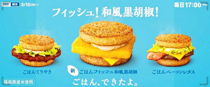 일본 맥도날드의 인기 메뉴 "필레 오 피쉬"를 밥으로 만든 생선 튀김 패티 버거 기간한정 판매를 3월 10일부터 단품 390엔, 세트 690원에 판매를 시작합니다. 이번에 일본 맥도날드에서만 맛볼 수 있는 일본 맥도날드의 밥 버거에 맞게 개발 된 간장과 굵게 갈은 후추, 구운 마늘 가루를 넣은 감칠맛 나는 오리지널 소스, 밖은 바삭 바삭, 안은 촉촉한 통통 피시 패티와 치즈의 고소한 향의 풍미가 간장 맛 밥버거 번과 딱 맞습니다.