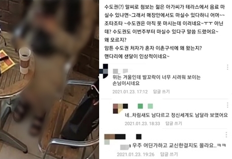 사진을 올린 작성자는 "수도권 말씨의 처음 보는 젊은 아가씨가 '테라스에서 음료 마실 수 있냐'고 물었습니다. 매장 내에서도 마실 수 있다 하니 '어머 좋다~수도권은 아직 못마시는데'라고 했다"면서 "수도권 처자가 혼자 왜 촌구석에 왔는지. 맨다리에 샌들이 인상적"이라고 적었습니다.